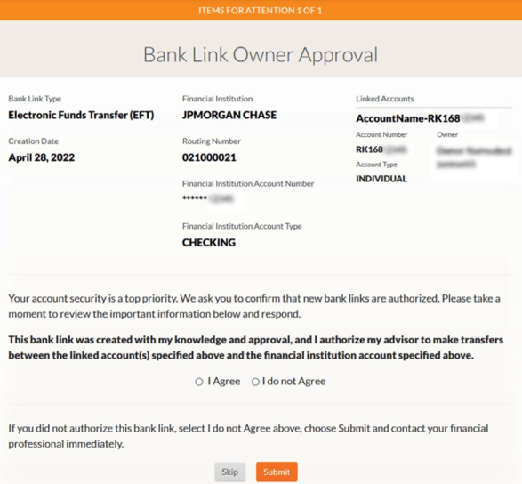 Starting next Monday, May 16th, setting up a bank link will now be a quick, easy and fully electronic process, eliminating the need for a paper check. You submit to EQIS the EFT Authorization Form and we will enter the bank information to instantly generate a notice to the client to log into the custodian’s website and confirm the bank information. Once the client clicks Confirm the bank link is immediately active and available for use.