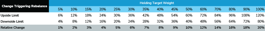 • Example: A target weight of 30% means downside trigger at 24% and upside trigger at 36% (simply