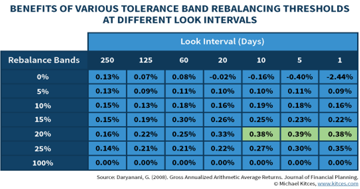 Another notable benefit of this approach is that since only the investment that crosses the threshold needs to be rebalanced, in a multiasset-class portfolio the tolerance band approach will reduce the volume of rebalancing trades. While conceptually the idea of establishing target allocation tolerance bands for rebalancing is relatively straightforward, the question still arises about exactly what the optimal threshold levels would be for those tolerance bands. A 2007 study in the Journal of Financial Planning by Gobind Daryanani entitled “Opportunistic Rebalancing” studied rolling 5-year periods from 1992 to 2004 and found that the optimal rebalancing threshold was at a relative threshold of 20% of the investment’s original weighting, allowing investments to deviate above and below target a reasonable amount without triggering a buy or sell trade. The study also revealed that there should be no limit to the frequency of rebalancing (Look Interval) and instead the investor should “look constantly.”