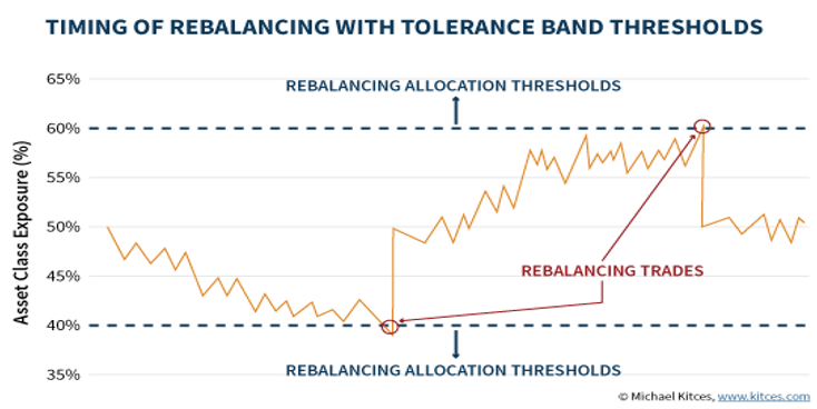 Thresholds allow for a portfolio to benefit from the outperforming asset class without the portfolios total risk elevating beyond the investor’s tolerance. The result of establishing minimum and maximum weights before rebalancing is triggered is that it forms allocation tolerance bands, as illustrated below. In the following chart, a portfolio that was targeting 50% in equities will now trigger a rebalancing trade if the allocation falls below 40% or rises above 60%. Anywhere in between those thresholds and the portfolio remains a buy-and-hold strategy, allowing outperformers to run. When either tolerance threshold is breached to the upside or downside, a sell or buy is triggered, controlling risk.