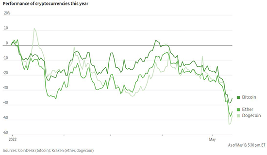 Cryptocurrencies have been treated by investors more like a risk asset than a diversifier this year. The 40-day correlation of Bitcoin with the Nasdaq 100 index of technology stocks has risen to 0.82 recently, near an all-time high. As technology stocks have come under pressure from rising interest rates, cryptocurrencies have sold off alongside them. Last week, cryptocurrencies endured an intense bout of selling due to issues related to the major stablecoin TerraUSD. Stablecoins are designed to maintain a fixed rate of exchange in contrast to other cryptocurrencies, and are a key part of the infrastructure to facilitate transactions. The algorithmic stablecoin TerraUSD was intended to maintain a peg of $1 USD via a mechanism with its sister token Luna. However, that peg broke down last week, with TerraUSD falling to as low as 10 cents Friday before recovering to roughly 14 cents. Luna tumbled by 99% from $60 on Monday to less than half a cent by the end of the week. The unravelling sent ripple effects through crypto markets, with the largest stablecoin Tether also being dragged down briefly by spreading fear before stabilizing. Bitcoin and Ether both recovered on Friday but remain down 13% and 20%, respectively, over the last five business days.