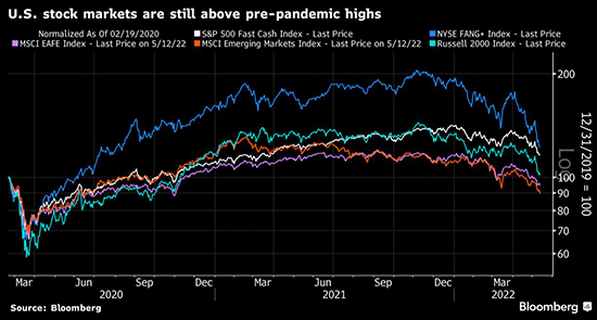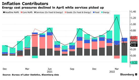 The US Labor Department’s Consumer Price Index (CPI) data last week for the month of April indicated that the headline inflation rate cooled slightly to an 8.3% annual rate, down slightly from its 40-year peak of 8.5% in March. The first decline in headline inflation in eight months was mostly attributed to an easing of gasoline prices as crude oil remains rangebound. The core CPI, which strips out volatile food and energy prices, rose at an annual rate of 6.2%. However, when comparing the figures to the prior month, core CPI rose 0.6%. This was well ahead of both Bloomberg’s median projection of 0.4% and greater than headline month-on-month figures of 0.3%. This is a worrying sign that inflation is broadening from goods inflation related to supply chains to more persistent factors. Services prices excluding energy rose 0.7% in April relative to March, marking the most rapid one-month increase for services since 1990. Housing costs account for nearly one-third of CPI and rose 4.8% from a year ago, a rate not seen in decades. Meanwhile, the Producer Price Index rose at an annual rate of 11% in April, also moderating slightly from the March rate of 11.5%. The University of Michigan survey of US consumer sentiment unexpectedly declined in the wake of the inflation report to its lowest level since 2011.