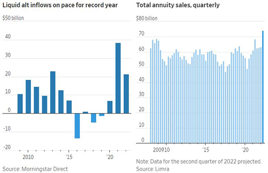 The selloff in both stocks and bonds this year has led investors to broaden their allocations beyond traditional asset classes. Liquid alternative funds and ETFs are one area of the market that has seen inflows this year. Liquid alternatives include a wide array of strategies that often utilize derivates such as futures and options to attempt to provide diversification by generating returns with low correlations with traditional assets. Morningstar Direct shows that inflows into liquid alts this year through the end of May have totaled $21 billion, on pace to beat least year’s record inflows of $38.3 billion. EQIS offers access to several liquid alternative strategies, including the American Beacon AHL Managed Futures Fund and the Catalyst Millburn Hedge Strategy Fund. Annuities are another asset class that has attracted a surge in inflows so far this year. Fixed-rate annuities do not decline in value when interest rates increase, in contrast to bonds. The yields offered on fixed-rate annuities are now significantly higher compared to last year as well. Annuity sales are projected to have reached $74 billion in the second quarter of this year, which would beat the prior quarterly record that occurred during the financial crisis of 2008.