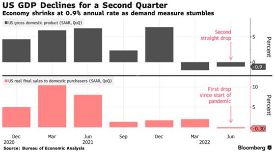 The US Federal Reserve raised the federal-funds rate again last week by 75 basis points. The benchmark interest rate now stands at a target range of 2.25% to 2.5%. The next day, the US Commerce Department released its preliminary estimate for US GDP in the second quarter, showing that the economy contracted at an annualized rate of 0.9%. This is the second consecutive quarter of contraction after economic activity declined at an annualized rate of 1.6% in the first quarter, in large part due to the negative impacts of both trade and inventories. The effects of those components can be stripped out to calculate US real final sales to domestic producers, which is an important gauge of underlying demand in the economy. That figure showed a decline of 0.3% in the second quarter, marking the first drop since the start of the pandemic. Though two consecutive quarters of negative economic growth is sometimes used as the barometer of a recession, the official determination of a recession is made by the National Bureau of Economic Research, which incorporates a wider range of factors. Fed Chairman Jerome Powell stated, “I do not think the US is currently in a recession. There are just too many areas of the economy that are performing too well.” Though typically an economic contraction would be taken as a negative, the Fed took the view that this was a positive development in that the efforts to cool the overheated economy and rein in inflation are beginning to have the desired effect. The Fed also indicated that it may slow the pace of rate hikes if the economy continues to slow. Markets counteractively rallied immediately after the Fed decision on the possibility of slower future rate hikes.