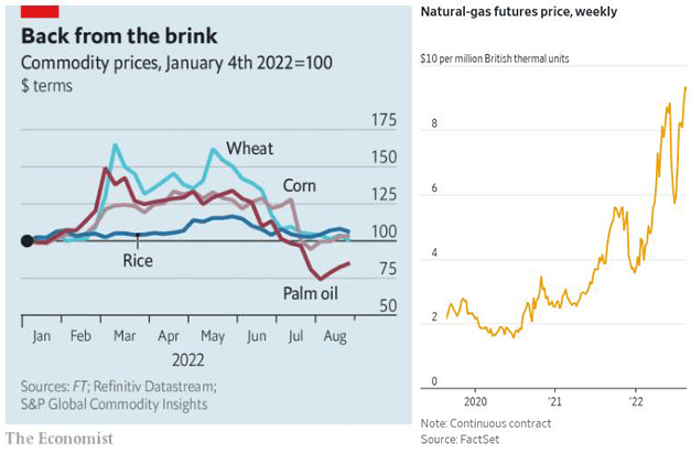 While global central banks pull the policy levers at their disposal to rein in inflation, commodities prices remain beyond their control. The current environment for commodities remains mixed with an undetermined impact on the path of inflation. Agricultural commodities have been one welcome bright spot in recent months. The prices of staple crops such as wheat and corn soared following Russia’s invasion of Ukraine back in February, as both those countries are major exporters of those goods to the rest of the world. The prices of many of those agricultural commodities have since collapsed to their pre-war levels as fears of shortages have proven to be overblown. Russia is on course to deliver a record harvest of wheat this year and a deal has been brokered for Ukraine to resume agricultural exports. While agricultural commodities may take some pressure off inflation, the outlook for fossil fuels is more uncertain. The scramble among European countries for alternatives to Russian natural gas is having ripple effects around the world. US natural gas futures surged again last week to a 14-year high. This is the most expensive natural gas has been in the US since the wide rollout of hydraulic fracturing technology greatly increased US gas production. The strong demand for exports of natural gas to other markets is weighing on domestic supplies, with inventories currently low for this time of year. Markets for crude oil have not been as tight due to expectations for lower demand as global economic growth slows. However, the Organization of Petroleum Exporting Countries is beginning to mull the idea of cutting production levels to help prop up the price of oil. That briefly sent the price of global benchmark Brent Crude back up over $100 per barrel last week. Though a worst-case scenario for commodities markets may have been avoided so far, it is still too early to sound the all clear.