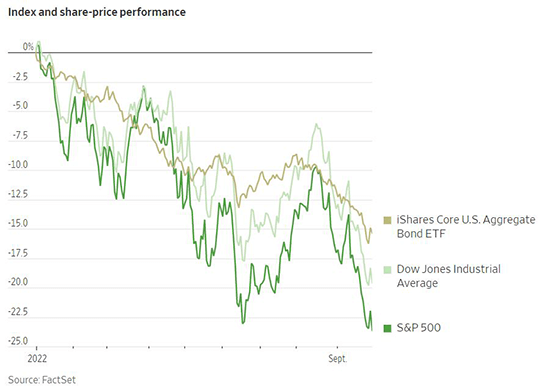 The final day of the third quarter saw the most recent release of the Personal-Consumption Expenditures price index, which is the US Federal Reserve’s preferred gauge of inflation. Headline PCE rose 6.2% in August compared to a year ago, slower than July’s 6.4% rate. However, core PCE, which excludes volatile food and energy prices, accelerated to 4.9% in August compared to last year. This represents a worrying increase in price pressures in comparison to the 4.7% core PCE rate in July and mirrored trends in the Consumer Price Index. The continued increase in core inflation makes it more likely that the Fed will continue to raise interest rates for the near future, despite risking damage to the economy in the process. This final bit of unwelcome news pushed major equity indexes down for the week. The Dow Jones Industrial Average entered a bear market last Monday and is now down 21% for the year. Meanwhile, the S&P 500 fell below its prior low from before the short-lived summer rally and is now down 25% year to date. The Nasdaq Composite, whose technology companies are particularly sensitive to interest rates, has fallen 32% so far this year. International stocks have not fared any better, as an MSCI index of global equities outside the US also fell 11% during Q3 and is down 28% YTD. Bonds have also sold off again alongside stocks in the recent downward trend in financial markets. The iShares Core US Aggregate Bond ETF fell 5% during the quarter and is down 15% so far this year.