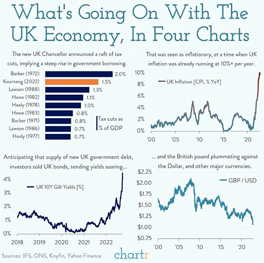 While the United Kingdom certainly is not alone among countries in facing serious macroeconomic headwinds, its position has been uniquely precarious due to a series of political missteps. Investor concerns about the trajectory of the UK economy escalated into a full crisis of confidence last week following the announcement of a budget plan by the administration of new Prime Minister Liz Truss. Despite the economy already being saddled with double-digit inflation, the new budget called for large tax cuts that would require some of the largest increases in debt issuance in the history of the UK. Such large tax cuts would act to stimulate the economy at a time when the central bank is already trying to slow the most serious outbreak of inflation in decades. Investors headed for the exits in spectacular fashion, with selling pressure sending the British Pound to near parity with the US dollar. UK government bonds also sold off dramatically, with the yield on the 10-year gilt soaring to near 5%. The 30-year gilt fell by an astounding 24% over the course of the week, threatening financial contagion through UK pensions’ exposure to long government bonds. The severe selloff also had spillover effects outside the UK, with selling in US government bonds sending the yield on the 10-year US Treasury note above 4% for the first time in more than a decade. The Bank of England was forced to intervene on Wednesday, pledging to buy long UK government bonds at whatever scale necessary to restore stability in financial markets. That extreme emergency measure proved sufficient to calm the bond rout for the time being, and the 30-year gilt recovered much of its losses by the end of the week. The 10-year gilt finished the week with a yield back near 4%, while the 10-year US Treasury note ended the week with a yield of 3.73%.