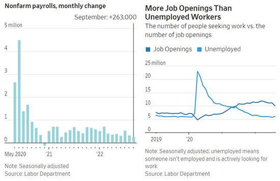 The US Labor Department released the September jobs report on Friday, which suggested that the US labor market cooled slightly but remains hot. US employers added 263,000 new jobs in September, a robust rate of job creation. This still was a welcome deceleration relative to the 315,000 jobs added in August. The unemployment rate unexpectedly dipped back down to 3.5% as the labor force participation rate decreased. That matches the 50-year low for the unemployment rate last touched in July. Wages rose by 5% in September compared to a year ago. This was a step in the right direction compared to August’s 5.2% increase in wages, but still a concerningly elevated reading. These data points mirrored the cooling trend shown by the August job openings report released earlier in the week. Total job openings fell by around 10% in August compared to the prior month to 10.1 million open positions. However, that is still much more than the 6 million people that were unemployed at that point. Altogether, the recent figures suggest that the labor market is beginning to loosen, but that there is still too much demand for labor relative to current supply. This reinforces expectations that the US Federal Reserve will raise interest rates again at its next policy meeting in November to reign in wages and inflation.