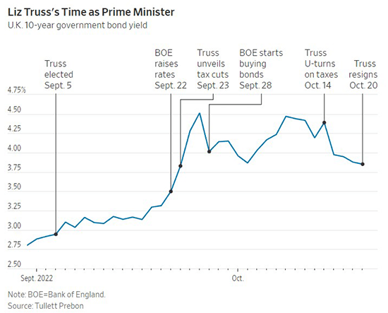 The prime minister's 44 days in office marked the shortest term ever in British history and was an anticipated outcome after the market’s negative response to her ill-timed tax cuts and policy missteps. Tax cuts meant to stimulate growth and ease the burden of rising energy costs were reversed as investors and politicians balked at the idea of unfunded public spending. The meltdown in government bonds (Gilts) required the intervention of the Bank of England and a temporary reversal of monetary policy to purchase assets and stabilize the markets.