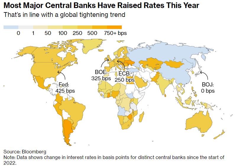 Major central banks in the US and Europe all raised interest rates last week, but their trajectories may diverge moving forward. The US Federal Reserve raised the benchmark federal funds rate by 50 basis points as was widely expected. This was a less aggressive increase than the 75 basis point hikes seen in the last four meetings. Given the historically rapid pace of monetary tightening so far, Federal Reserve Chairman Jerome Powell indicated it may be appropriate to hike by only 25 basis points at the next policy meeting at the end of January. Fed officials are now estimating that interest rates will peak at the range of 5% to 5.5% next year.