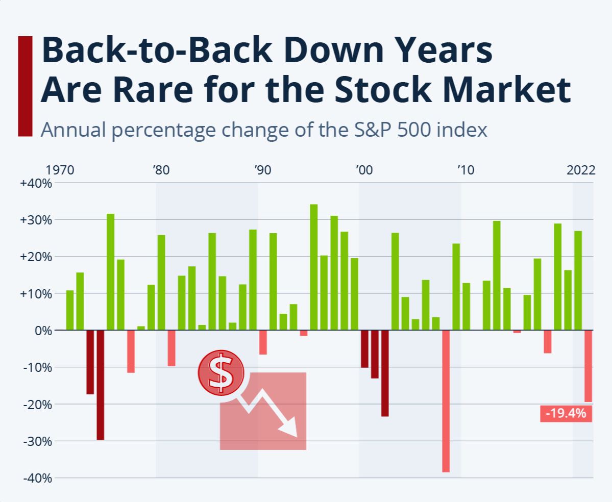 The S&P 500 had a historically bad year in 2022, ending with a loss just shy of 20%. That makes 2022 the worst year for the S&P 500 since 2008, and its fourth-worst year ever since the index was expanded to 500 companies all the way back in 1957. However, it is important to note that consecutive years of negative returns are very rare for the S&P 500. This has only happened during 1973 to 1974 and the three-year period of 2001 to 2003. Going back to 1957, the S&P 500 has had 18 calendar years where it recorded a loss. In the years following a down year, 14 out of 18 of those occurrences saw the index record a positive return. The S&P 500 has on average seen a gain of 15% in the years following a negative return. Of course, this is by no means a prediction for what will happen in any given year but is perhaps a reason for optimism heading into 2023.