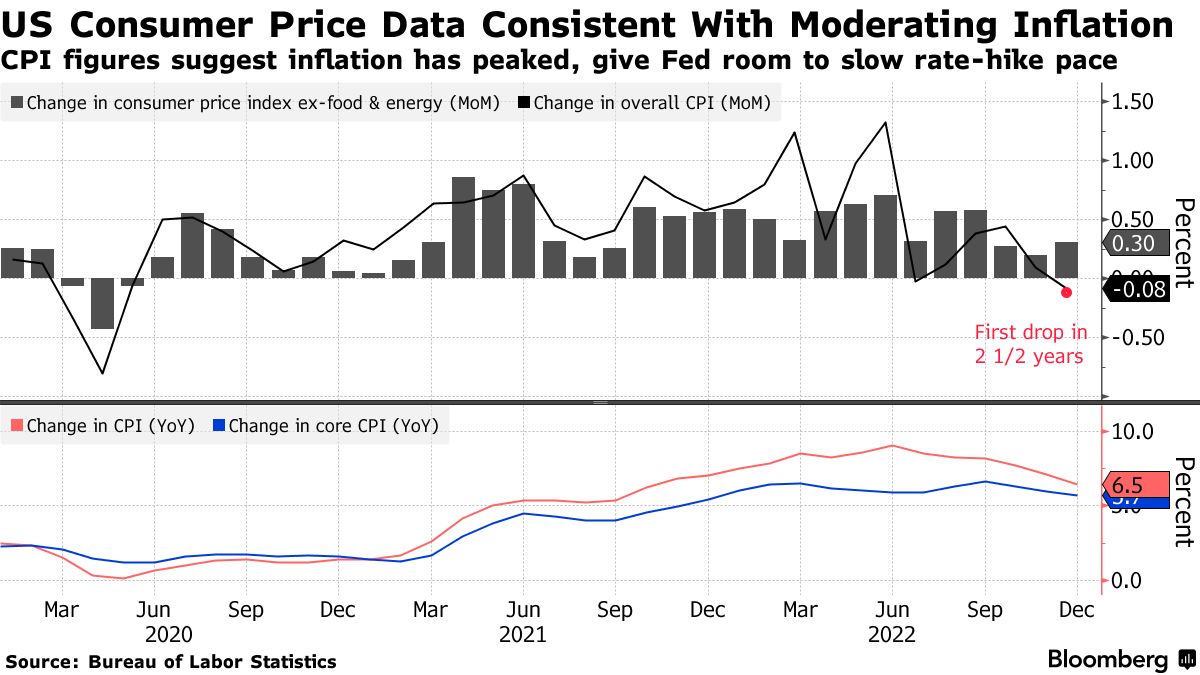 The Consumer Price Index (CPI) for December showed that US inflation continued to moderate for the sixth consecutive month since peaking in June. The CPI rose 6.5% last month compared to a year ago, in line with forecasts, while it fell 0.1% compared to the prior month, recording its first monthly decrease in 2 ½ years. Gasoline prices fell 9.4% last month and were the largest contributor to the cooler headline CPI figure. Core CPI, which excludes volatile food and energy prices, rose 5.7% compared to a year ago, its smallest increase in a year. Core CPI rose 0.3% compared to the prior month, also in line with economists’ forecasts. While goods prices continue to ease, services prices are still rising. This can be partially attributed to increasing shelter costs, which rose 0.8% in December. However, CPI calculates shelter costs with a lag, and more current indicators of rents show they are falling, decreasing the concern for that factor. The continuation of the easing price pressures may allow the Federal Reserve to downshift to an interest rate increase of 25 basis points at its next meeting in February.