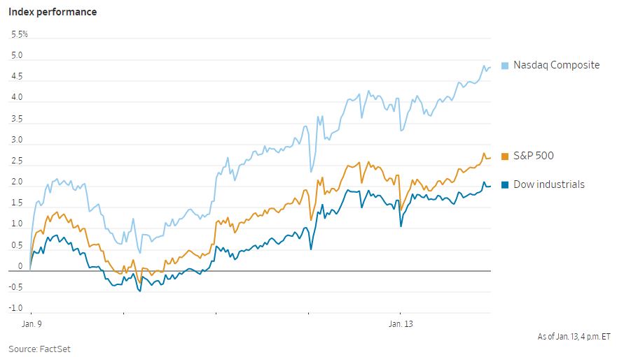 Several major US banks were among the companies to report fourth-quarter earnings last week, with Bank of America, Citigroup, Wells Fargo, and JPMorgan all beating analyst estimates for earnings for the quarter. So far, the increased interest income they received from higher interest rates from the US Federal Reserve has outweighed the slowing economy. Consumer spending remains strong, with credit card spending at those four banks up 10% relative to a year ago. However, consumers are not paying down their balances as quickly, with credit card balances rising 17%. That shows possible limits for future consumer spending power, though defaults remain low. The University of Michigan consumer sentiment survey rose to its highest level since April, showing Americans are more optimistic about the state of the economy. Consumer expectations for inflation one year from now also eased. Equities responded positively to these data points, with the Nasdaq Composite, S&P 500 and Dow Jones Industrial Average all recording gains of more than 2% for the week.