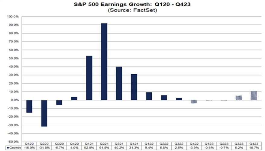 With the fourth quarter earnings season in full swing, FactSet reports that year-over-year earnings growth for the S&P 500 is expected to turn negative. Currently, aggregate earnings for the S&P 500 are forecasted to fall by 3.9% compared to a year ago. Earnings forecasts for 2023 also fell steadily through the second half of the year. While robust earnings growth was previously forecasted for Q1 and Q2 of 2023, today earnings are expected to contract through the first half of the year. Currently earnings are expected to decline by 0.6% in Q1, followed by another contraction of 0.7% in Q2. 10 out of the 11 sectors in the S&P 500 have had earnings estimates revised downward in recent months, with consumer discretionary, communication services, and materials seeing the largest downgrades. This is important, as market price reactions to CPI prints and FOMC meetings have decreased recently, while price movements following earnings beats and misses have risen in magnitude. However, after three consecutive quarters of expected decline, earnings are forecasted to return to growth in the second half of 2023. Third quarter 2023 is forecasted to see earnings growth of 5.2% followed by strong growth of 10.7% in the fourth quarter.