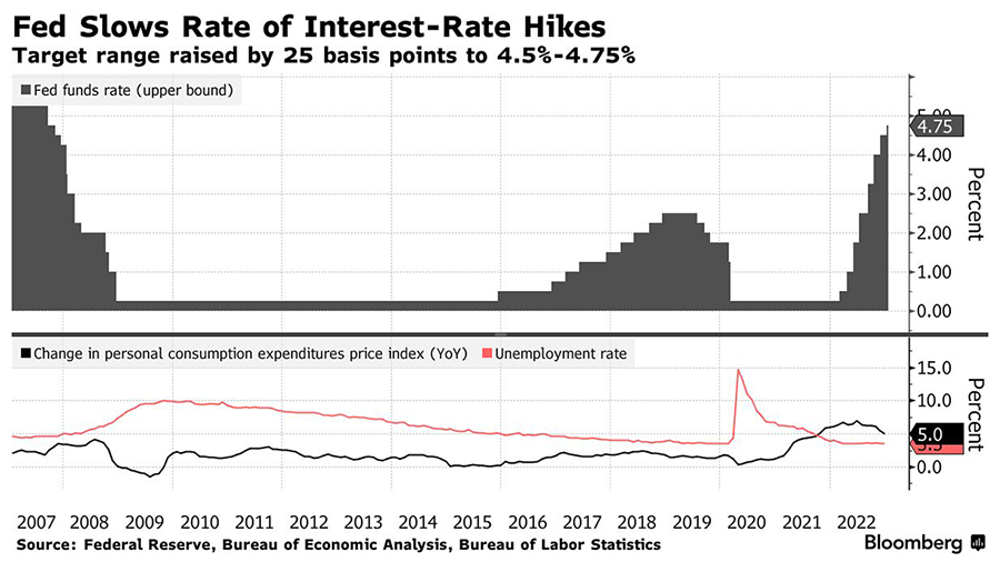 The market was quiet for the first half of the week as investors waited for the conclusions of the FOMC. Equities rallied following the Fed decision for a smaller rate hike, with the longer duration growth stocks in the Nasdaq Composite and S&P 500 responding more positively. Markets drifted lower on Friday following the blockbuster jobs report due to concerns that the Fed may have to raise interest rates further to bring inflation under control. Despite the losses on Friday, the S&P 500 and Nasdaq ended the week with gains, while the Dow Jones Industrial Average ended roughly flat. The communication services and technology sectors had the strongest showing and ended the week with gains near 4%. The energy sector was easily the laggard last week with a loss of around 4.5%. Energy equities have rallied strongly to start the year, with the S&P 500 up roughly 9% to date while the beaten-down Nasdaq had gained roughly 17%. The yield on the US 10-year Treasury note fell to as low as 3.358% following the FOMC meeting but surged again in the wake of the jobs report back up to 3.512%.
