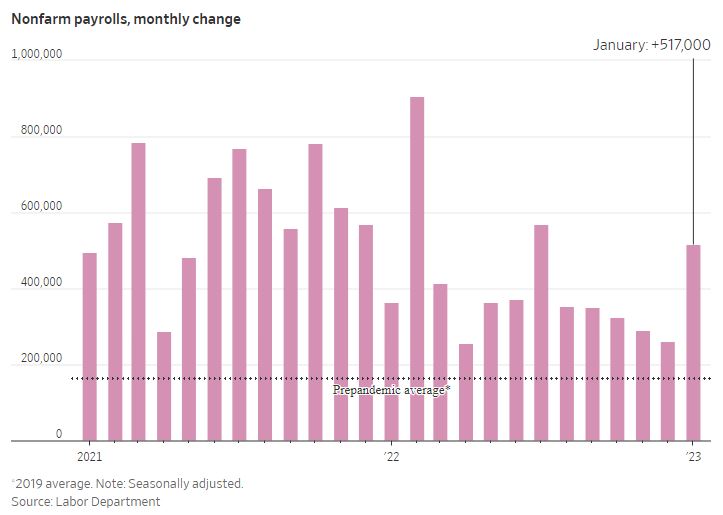 While the prices of goods and energy have declined in recent months, the path of inflation in the US moving forward will be highly contingent on the dynamics of the labor market. The signals for the jobs market have been decidedly mixed, with the Labor Department reporting last week that the employment cost index rose by 1% in the fourth quarter. This was below the consensus forecast for an increase of 1.1% and suggested that labor market pressures on inflation may be easing. However, the January nonfarm payrolls report released on Friday provided a stunning contrast to the slowing trend seen in other figures. The US added 517,000 new jobs in January, far and away above the consensus forecast for 187,000 new jobs. The unemployment rate also dipped even lower to 3.4%, while job openings rose by 600,000 in December to 11 million, or roughly 1.9 open jobs per unemployed worker. Thankfully, wage growth continued to ease last month despite the strong hiring activity. Average hourly earnings rose 4.4% in January compared to a year ago, slowing from December’s rate of 4.8%. While recent data on consumer spending had suggested a weakening trend, an updated gauge of services spending also surprised to the upside on Friday. The ISM non-manufacturing index snapped back into strong expansion in January after a weak reading in December. The robust spending on services challenges the narrative that consumer spending is running out of gas and suggests instead that spending is shifting from goods to services. These surprisingly strong economic readings challenge the narrative that inflation is likely to ease further and complicate the Fed’s task of achieving a soft landing for the economy.