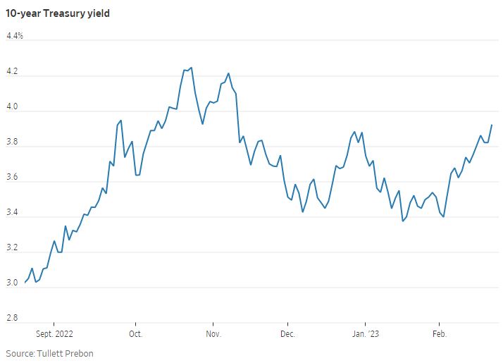 As they were for much of last year, investors are once again hanging on any indication of how the Fed will respond to a stronger-than-expected economy. Rising Treasury yields erode investors’ willingness to pay up for stocks and corporate bonds because buying Treasurys lets investors lock in attractive returns with lower risk. After raising interest rates by three-quarters of a percentage point at four straight meetings last year, the central bank downshifted to a half-percentage-point increase in December and followed that with a quarter-point rise in February. Coming into this year, many investors assumed that declining inflation and a slowing economy would give the Fed the go-ahead to ease off, but strong data have now shaken that assumption.