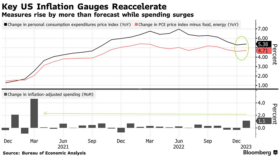 In January, the US Federal Reserve’s preferred inflation gauge, the personal consumption expenditures (PCE) price index, accelerated unexpectedly after several months of decline. The PCE price index rose 5.4% from a year earlier, while the core metric increased by 4.7%, both exceeding projections. Both headline and core PCE accelerated to a substantial 0.6% increase from the prior month. Meanwhile, consumer spending surged after a year-end slump, with spending adjusted for prices jumping 1.1% from the previous month after consecutive monthly declines, the most in nearly two years. The increase in personal spending in January reflects a pickup in outlays for goods and services, including motor vehicles, food services and accommodation. With the unemployment rate at its lowest level in over 53 years and intense competition for a limited supply of workers, higher wages paired with excess savings have allowed consumers to keep spending for a variety of goods and services despite the rapid price increases. Incomes also rose 0.6% in January, bolstered by an acceleration in wage growth. Inflation-adjusted disposable income surged 1.4%, the biggest advance since March 2021, while wages and salaries, unadjusted for prices, increased 0.9%, the most since July. Resilient consumer spending, paired with the exceptional strength of the labor market, will also make it more difficult for the Fed to achieve its inflation goal.