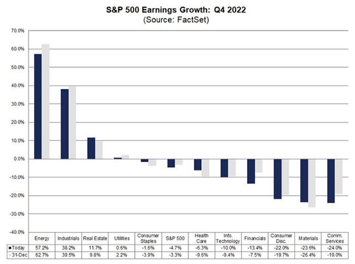 With 82% of S&P 500 companies having reported their Q4 2022 earnings so far, aggregate earnings have beaten estimates by just 1.3%. That is lower than the 1-year average (+3.7%), 5-year average (+8.6%), and 10-year average (+6.4%). This marks the seventh consecutive quarter in which the EPS surprise percentage for the index has decreased. This is due to overestimated earnings for companies in specific sectors and industries, resulting in fewer companies beating EPS estimates than average. Communication Services (-4.1%) and Consumer Discretionary (-0.4%) are currently reporting a negative earnings surprise percentage for Q4 2022, with Alphabet and Facebook contributing to the negative surprise for the Communications Services sector, and Amazon.com contributing to the negative surprise for the Consumer Discretionary sector. Other companies, such as Apple, Boeing and Goldman Sachs, have also reported negative EPS surprises, lowering the overall EPS surprise percentage for the index.