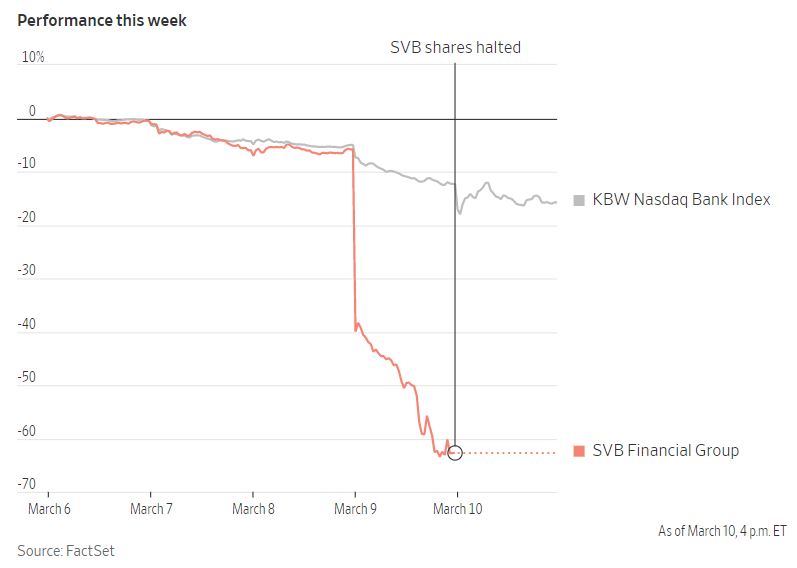 The Silicon Valley Bank failure on Friday prompted a deepening sell-off with the Dow Jones Industrial Average falling about 345 points. All S&P 500 sectors fell in afternoon trading and Treasury yields tumbled, with investors adjusting their rate-increase expectations lower. The S&P 500 fell nearly 5% for the week, while bond yields fell as bond prices rose. The issue is said to highlight the broader impact the Fed's interest-rate increases are having on the economy and banks in particular. With wage growth seen as a major contributor to inflation, and unemployment ticking higher, it's possible that the Federal Reserve may alter its rate-hike pace. Investors have been looking for a slowdown in the labor market that would allow the Fed to ease its pace of rate increases. The yield on the 2-year note dropped to 4.586%, its largest single-day decline since 2008, and traders are now once again betting the Fed will cut interest rates before year end. Major US banks had already lost billions in market value the previous day after Silicon Valley Bank's troubles first prompted broader concerns about the health of the financial sector. SVB's difficulties highlight a consequence of rising interest rates for some lenders, with many banks that hold large quantities of bonds sitting on large unrealized losses. The broader worry is that other banks lent a lot in the good times when rates were so low, which may come back to haunt them now that rates have risen so dramatically. Markets sold off across the globe , with several banks among the worst performers in the stock market, including PacWest Bancorp, Western Alliance Bancorp and First Republic Bank, which all plunged more than 20%.