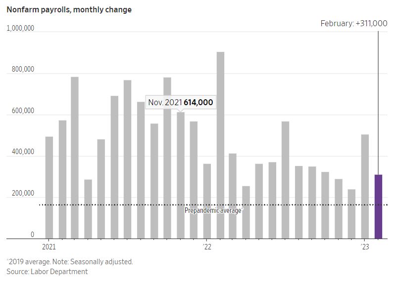 The US economy added 311,000 jobs in February, according to the Labor Department. The unemployment rate rose to 3.6%. This news supports other evidence of a strong US economy despite high inflation and rising interest rates. Employers in leisure and hospitality, retail, and healthcare increased hiring last month. However, transportation and warehousing, finance, manufacturing companies, and the tech-heavy information sector cut employees. Average hourly earnings grew 4.6% in February from a year earlier, slightly below last year but above pre-pandemic levels. The job market continues to surprise economists, with many predicting that job gains would cool sharply or even become losses. The Federal Reserve is closely monitoring jobs and inflation figures as it decides how much to raise interest rates this month. The new jobs offset cuts announced by large employers such as Google, Amazon, and Disney. There are indications that strong hiring could continue, with employers having nearly double the number of open jobs as unemployed people seeking work. Elevated wage growth is a challenge for the Fed and an indication that the economy is still overheating. Overall, the US economy remains resilient despite high inflation and interest rates.