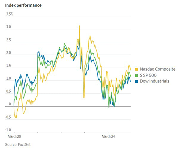 All three major indexes finished last week in positive territory as the Nasdaq closed up 1.66%, the S&P 500 up 1.39%, and the Dow Industrials up 1.18%. Treasuries rallied and the dollar index was up 0.6%, with gold and bitcoin futures down. WTI crude settled down 1.0% but was still up 3.8% for the week. Concerns about uninsured deposits and bank borrowing from the Fed's backstop facilities remained elevated, while the March S&P US Flash manufacturing and services PMIs beat expectations. February US durable goods orders posted a surprise contraction, and Fed commentary indicated that while a recession is not the base case, regulators are ready to take further actions should the bank crisis worsen.