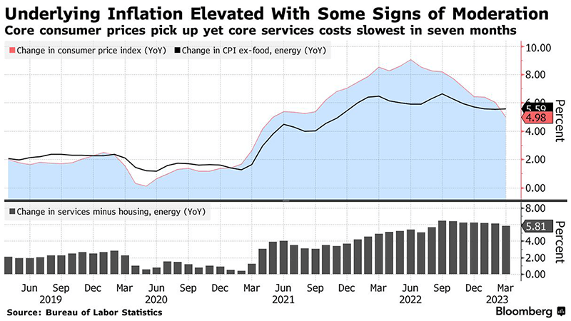 US inflation eased to its lowest level in nearly two years in March. The Consumer Price Index (CPI), which measures what consumers pay for goods and services, rose 5% year-on-year, down from February's 6% increase and the smallest gain since May 2021. However, core prices, a measure of underlying inflation that excludes volatile energy and food categories, increased 5.6% YoY, accelerating slightly from 5.5% the prior month. This was the first time in over two years that the core came in above the overall measure. Core inflation, which economists see as a better predictor of future inflation, has stayed stubbornly high due to inflationary pressures from shelter costs. Because of the way housing metrics are calculated, there is a significant lag between real-time price changes and government statistics. Economists are expecting shelter inflation to trend significantly lower later this year. The US Federal Reserve raised interest rates by a quarter percentage point in March, bringing it to a range between 4.75% and 5%, and indicated that another increase could happen at its early May meeting. With core inflation easing only slightly in month-on-month terms to 0.4% in March compared to the 0.5% increase seen in February, the Fed is still likely to raise interest rates again at its May meeting. Swaps pricing currently implies an 80% chance of a quarter-point rate increase in May. Most expect the Fed to pause rate hikes after the May meeting, provided the economy grows slower this year and labor demand cools.