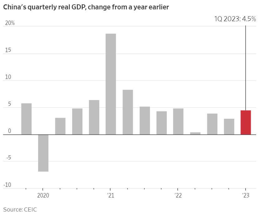 China’s economy grew by 4.5% in Q1 2023 compared to the same period a year earlier, according to Beijing’s National Bureau of Statistics. That beat economist estimates and marked the fastest rate of growth since Q1 2022 and was an improvement on Q4 2022’s 2.9% rate. Retail sales, which jumped more than 10% in March from a year earlier, played a significant role in the country’s economic recovery, offsetting a sharper-than-expected slowdown in real estate, infrastructure and other private-sector investments. This marked the first month in two years that the year-over-year gain in retail sales outpaced the increase in both industrial production and fixed-asset investment. The rebound in consumer spending is largely organic and not reliant on stimulus, leading economists to believe that economic momentum will improve in the second quarter and for gross domestic product growth to surpass 6% this year—comfortably above the official government target of around 5%. In another sign of recovering economic activity, oil demand is rebounding, with China's apparent petroleum demand rising nearly 10% year over year in March. However, investment in the property sector, which has played a significant role in driving China’s economic growth over the past decade, has yet to stabilize, with property investment dropping 5.8% in Q1 compared with a year earlier. The big question for the economy this year is whether the jump in consumer spending is merely ephemeral, known as “revenge spending,” or whether it heralds a more lasting shift toward consumers playing a greater role in driving overall growth. Although China still has a significant economic hole to climb out of, the latest figures show that it is back in business and remains a formidable global economic force. On Tuesday, both UBS and Citigroup raised their GDP forecasts for China this year to 5.7% and 6.1%, respectively, well above the official growth target of around 5%.