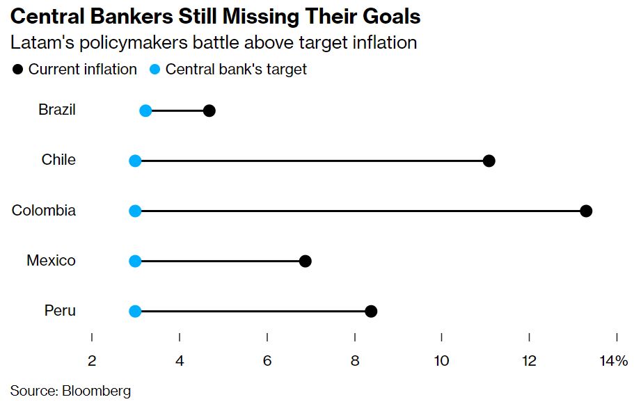 Though Latin America stands to benefit from renewed demand from China for commodity exports, the region is still saddled with high interest rates enacted to combat inflation. Latin American policymakers are warning investors that their battle against inflation will take longer than expected, despite aggressive interest rate hikes. During the International Monetary Fund’s Spring Meetings, officials from Brazil, Chile and Peru expressed the need for more proof that price pressures are easing before cutting borrowing costs. The region’s top economic authorities are asking for patience from the market as they hold rates higher. The message is a sharp turnaround from the previous round of IMF meetings in October, when disinflation was expected. Core measures of inflation that strip out volatile items like food and energy are still accelerating in the region, making it harder to cut rates without the risk of having to reverse course and lift them again. Latin America’s inflationary pressures are getting an additional jolt from a backdrop of steadily higher borrowing costs in the world’s main economies. Despite some heads of state criticizing policymakers’ positions, regional central bankers are doubling down on their fight against inflation. Growth forecasts for the region have been revised down as credit flows slow down and households struggle with indebtedness. Many countries are also facing drastic weather events that hinder activity, pushing authorities to find alternative sources of financing. The region has some structural issues to deal with, including infrastructure, education and health, and it can’t make a big dent in poverty at economic growth rates of around 2%, as most multilateral organizations expect.