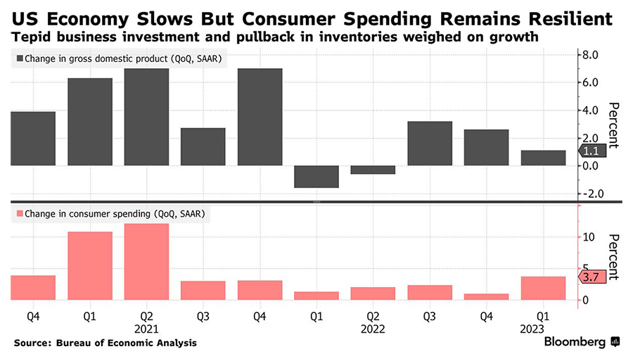 US economic growth slowed to an annualized rate of 1.1% in the first quarter in a sharp slowdown from the 2.6% annualized growth rate seen in the fourth quarter. This was due to a decline in business investment and a pullback in inventories, according to the Commerce Department’s initial estimate. However, the strongest consumer spending in almost two years helped support the GDP figure for the quarter, though more recent data suggests consumer spending may be slowing as well. Retail sales, homes sales and manufacturing output all decreased in March. The resiliency of the job market will determine the outlook, with low unemployment and wage gains allowing consumers to weather high inflation and maintain spending. The GDP data showed services spending rose 2.3%, led by healthcare and restaurants and hotels, while outlays on goods rose 6.5%, the most in almost two years. The economic slowdown is expected to be more evident in the second quarter, with economists predicting GDP to grow at a stall-speed pace of 0.2%.