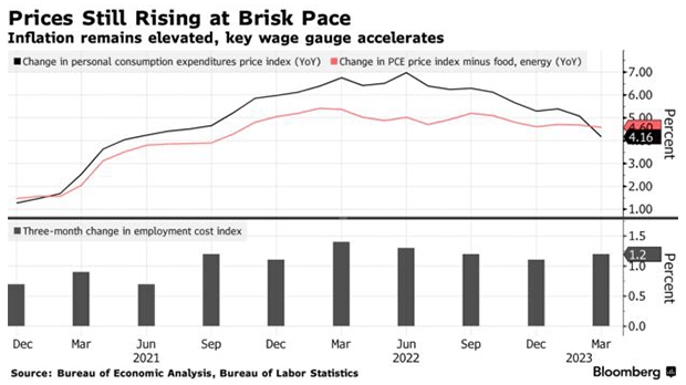 The latest US economic data indicates that inflation pressures remain persistent. The personal consumption expenditures price index (PCE), the Federal Reserve's preferred measure of underlying inflation, rose 4.2% in March compared to a year ago, slowing from February’s gain of 5.1%. However, the core-PCE index, which excludes volatile food and energy prices, rose 4.6% in March from a year earlier, barely slowing from February’s 4.7% increase. The Labor Department's employment costs measure also rose 1.2% in Q1 from the previous quarter, exceeding forecasts. However, a deceleration in a closely watched measure of services costs offers some relief. The report suggests that rising labor costs, particularly in the service sector, could keep price growth above the Fed's target for the foreseeable future. The data reinforce expectations that Fed policymakers will raise the benchmark interest rate another quarter percentage point at this week's meeting. While consumers are still enjoying a strong labor market and excess savings, the latest figures suggest they are beginning to cut back on discretionary purchases. A lack of growth in spending could make it difficult for the economy to keep expanding. Finally, a separate report showed that longer-term inflation expectations ticked up in April.