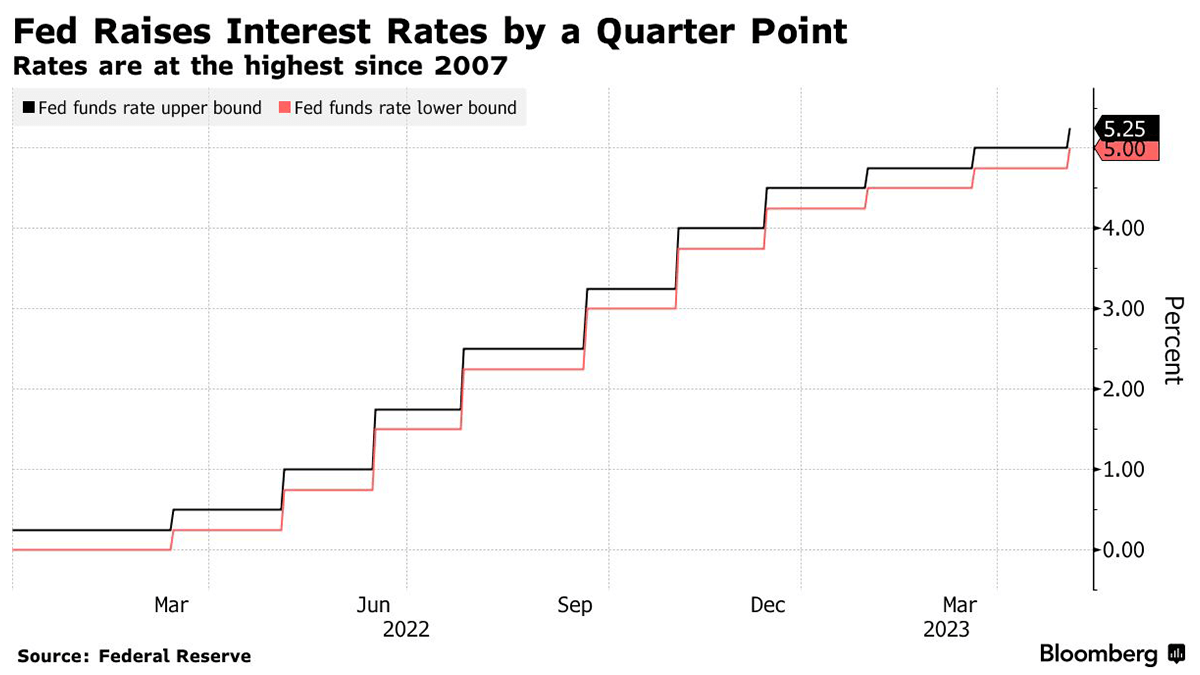 The US Federal Reserve raised interest rates by a quarter percentage point last week, bringing them to the highest level since 2007. The decision marked the 10th consecutive increase aimed at fighting inflation and took the benchmark federal funds rate to a range of 5% to 5.25%. The Federal Open Market Committee (FOMC) also hinted that this may be the last increase in the most aggressive tightening campaign since the 1980s, as economic risks mount. The FOMC omitted a line from its previous statement in March that said the committee “anticipates that some additional policy firming may be appropriate.” The FOMC has instead said it will take into account various factors “in determining the extent to which additional policy firming may be appropriate.” Policymakers are resolved to ensure inflation will continue decelerating, even as the banking system endures ongoing stress and lawmakers step up criticism. Though some data has suggested the labor market may be weakening, the April jobs report showed hiring picked back up to 253,000 new positions, the strongest monthly gain since January. The unemployment rate remained unchanged at 3.4%, while wages rose 4.4% from a year earlier in a slight acceleration compared to March. Although the Fed may be finished raising rates, Powell and his colleagues have pledged to keep them elevated for a time to make sure the central bank’s preferred measure of inflation continues receding toward the 2% target. However, prices of interest-rate futures have long signaled an expectation in markets that the Fed would pivot to rate cuts in coming months. Rates on swap contracts linked to Fed meetings moved higher, to levels consistent with a stable policy rate until September, followed by at least two quarter-point cuts by year-end. Meanwhile, the European Central Bank also raised its key interest rate last week by a quarter of a percentage point, its smallest rate hike since it started raising rates rapidly last summer.