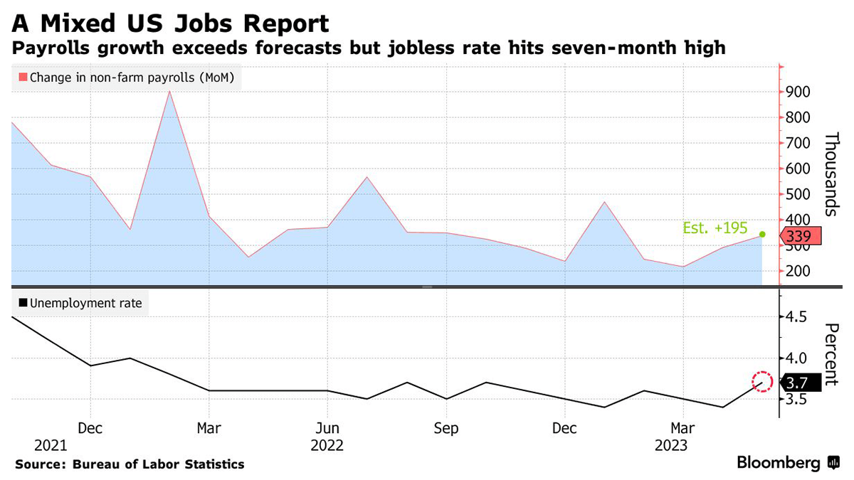 In May, hiring in the United States accelerated for the second consecutive month, indicating a resilient labor market despite rising interest rates and elevated inflation. According to the Labor Department, U.S. employers added 339,000 jobs last month, with upward revisions to the job totals for March and April resulting in a net gain of 93,000 jobs. However, the unemployment rate rose slightly to 3.7% from April's 3.4%. The strong hiring and low unemployment have contributed to upward pressure on wages, with average hourly earnings growing by 4.3% in May compared to the previous year, similar to the gains in March and April. Despite the positive overall hiring trend, there were some signs of weakness in the report. Unemployment rates increased for women and Black Americans, both of whom had seen improvements in joblessness in recent years. The average workweek fell to 34.3 hours, the lowest since April 2020, and average weekly earnings advanced at a slower rate than hourly earnings due to fewer hours worked. Additionally, the labor-force participation rate remained flat at 62.6% in May, below the pre-pandemic level of 63.3% in February 2020. Despite the overall resilience of the labor market, some sectors, such as tech, finance and manufacturing, showed signs of stress. The information sector, in particular, cut 9,000 jobs in May. Companies like Facebook's Meta Platforms, Goldman Sachs Group and Grant Thornton have recently announced job cuts. However, overall layoffs have remained low and job openings increased in April, according to the Labor Department.