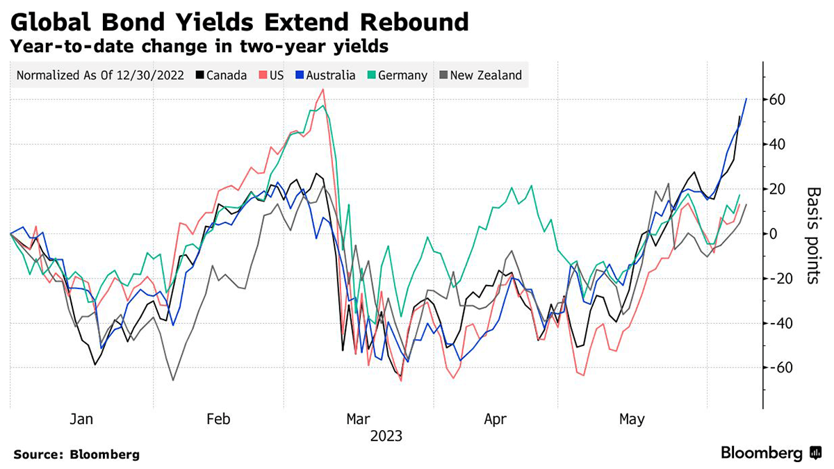 Global bond markets are experiencing a slump following two surprise interest-rate hikes, highlighting that central banks are still actively combating inflation. Investors are selling international sovereign debt after the Bank of Canada and the Reserve Bank of Australia unexpectedly raised rates to tackle persistent consumer-price increases. Shorter-maturity Treasury yields are nearing their highest levels since March, and Australian equivalents have reached levels not seen in over a decade. This shift is causing traders to reassess their expectations of Federal Reserve rate cuts later in the year, emphasizing the ongoing battle against inflation. Deutsche Bank strategists raised the question of whether the Federal Reserve might follow suit with a hike of its own or finally decide to keep rates unchanged after 10 consecutive increases. Investors briefly priced in a full quarter-point rate hike by the Fed before July, and although some easing is still expected by year-end, multiple rate cuts have been priced out of the market. A recent Bloomberg survey of economists showed most expected the Fed to pause at its June meeting, though a third still expected a hike of 25 basis points in July. The majority of the surveyed economists expected the Fed to continue tightening financial conditions by shrinking its balance sheet even after it reaches its peak interest rate for this cycle. All eyes are now on US inflation data for further insight into the Fed's policy trajectory. With inflation proving more persistent than anticipated, economists such as Diana Iovanel from Capital Economics believe the central bank will maintain higher policy rates for a longer period. While some firms suggest that US interest rates may have peaked, the situation in Europe is different. Traders are pricing in half a percentage point of rate hikes by the European Central Bank in the next three months, indicating that they believe the ECB must continue tightening due to inflationary pressures.