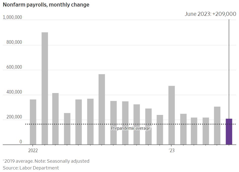 Hiring in the United States experienced a slowdown In June, with employers adding 209,000 workers compared to May's revised figure of 306,000. Despite the decrease, this remains a solid monthly gain. Despite the moderation in hiring, wages have continued to rise as employers compete for a limited pool of workers. Average hourly earnings grew by 4.4% in June compared to the previous year, maintaining a robust pace above the levels seen before the pandemic. The decline in unemployment also contributed to the wage growth trend, as the unemployment rate dropped from 3.7% in May to 3.6% in June. Various industries have contributed to job growth, with healthcare, construction and government sectors adding jobs in June. However, the leisure and hospitality sector experienced a slower pace of hiring, while retailers cut jobs. These patterns reflect a continuation of the overall positive trend in job creation, which has been sustained for the past two and a half years. However, there are signs of cooling in certain areas of the labor market. The number of people working part-time due to the unavailability of full-time work increased by almost half a million in June. Additionally, the labor force participation rate, which measures the proportion of Americans actively seeking employment, remains below pre-pandemic levels due to the aging population, leading to ongoing labor shortages. The latest employment and wage data suggests that economic activity has not slowed down as much as anticipated by Federal Reserve officials. As a result, it is highly likely that interest rates will be raised to their highest level in 22 years during the Federal Reserve's upcoming meeting on July 25-26.