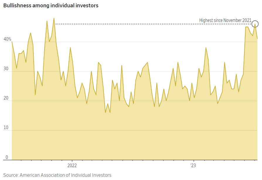 In 2023, the investment landscape appears to have disregarded the events of the previous year. There is a significant surge in risk-on investments, particularly in tech stocks and meme stocks. Speculative stocks are soaring, with the MEME ETF, tied to the Solactive Roundhill Meme Stock Index, rising 61% this year. Bitcoin has also defied expectations by climbing 80% in 2023. Retail traders are displaying heightened enthusiasm as bullish sentiment reaches its highest level since 2021. The bull-bear spread, indicating the difference between investors anticipating a market rise versus a decline, has been positive for six consecutive weeks, the longest streak since November 2021. Consumer confidence in the overall economy is growing, with sentiment surging to its highest level since September 2021. Notably, fear among investors seems to have dissipated as they are increasingly opting for bets that would benefit from further market rallies rather than seeking protection against potential downturns. This shift is reflected in the falling put-call ratio and the low Cboe Volatility Index (VIX), which measures options prices related to market declines.