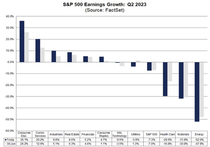 So far, 51% of the companies in the S&P 500 have reported actual results for Q2 2023. As of the mid-point of the Q2 earnings season for the S&P 500, more companies have reported positive earnings surprises than usual, but the magnitude of these surprises is lower compared to recent averages. Consequently, the index is reporting higher earnings for the second quarter compared to the end of the previous week but still lower earnings compared to the end of the quarter. In fact, the index is reporting its largest year-over-year decline in earnings since Q2 2020, with blended actual and estimated earnings falling 7.3% for the quarter. Positive earnings surprises in the Communication Services and Information Technology sectors have contributed to a decrease in the overall earnings decline for the index over the past week. However, downward revisions to EPS estimates for a company in the Health Care sector have partially offset this improvement. On the revenue front, 64% of S&P 500 companies have reported actual revenues above estimates, though slightly below the 5-year average. Nevertheless, the aggregate revenues are 1.5% above estimates, surpassing the 5-year average. Looking ahead, analysts still expect earnings growth for the second half of 2023. Projections indicate earnings growth of 0.2% for Q3 2023 and 7.5% for Q4 2023, with a predicted earnings growth of 0.4% for the entire CY 2023. The forward 12-month P/E ratio is 19.4, higher than both the 5-year and 10-year averages, indicating relatively high market valuations.
