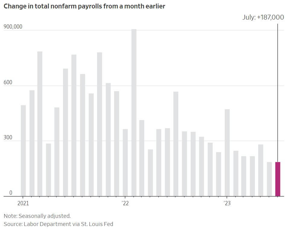 Employers in the U.S. slowed their hiring pace over the summer, signaling a gradual easing of the economy. In July, the U.S. economy added 187,000 jobs, slightly below the downwardly revised figure of 185,000 in June, and a significant drop from last year's monthly average of 400,000 job gains. The unemployment rate declined to 3.5% in July, indicating a strong job market near a half-century low. Average hourly earnings grew 4.4% in July compared to the previous year, slower than last year's growth but still higher than pre-pandemic levels. Fed officials estimate that wage growth of 3.5% would be consistent with their 2% target for inflation. Some sectors experienced job cuts in July, including temporary help services, tech and information companies, and retailers, while healthcare employers added staff. The employment report could relieve pressure on the Federal Reserve to raise rates at its next meeting in September. The central bank expects job growth to slow as part of its efforts to combat inflation. Officials will monitor additional hiring data for August and inflation readings for July and August before making any decisions. The economy appears to be on a slow but steady path toward a soft landing, where inflation returns to the Fed's 2% target without a recession or significant job losses. Despite the overall job gains, some industries, such as tech companies, retailers and temp agencies, have experienced slowdowns or job cuts. The hiring trend is now more concentrated in specific sectors like healthcare and government, while other sectors have not fully recovered from pandemic-related job losses.