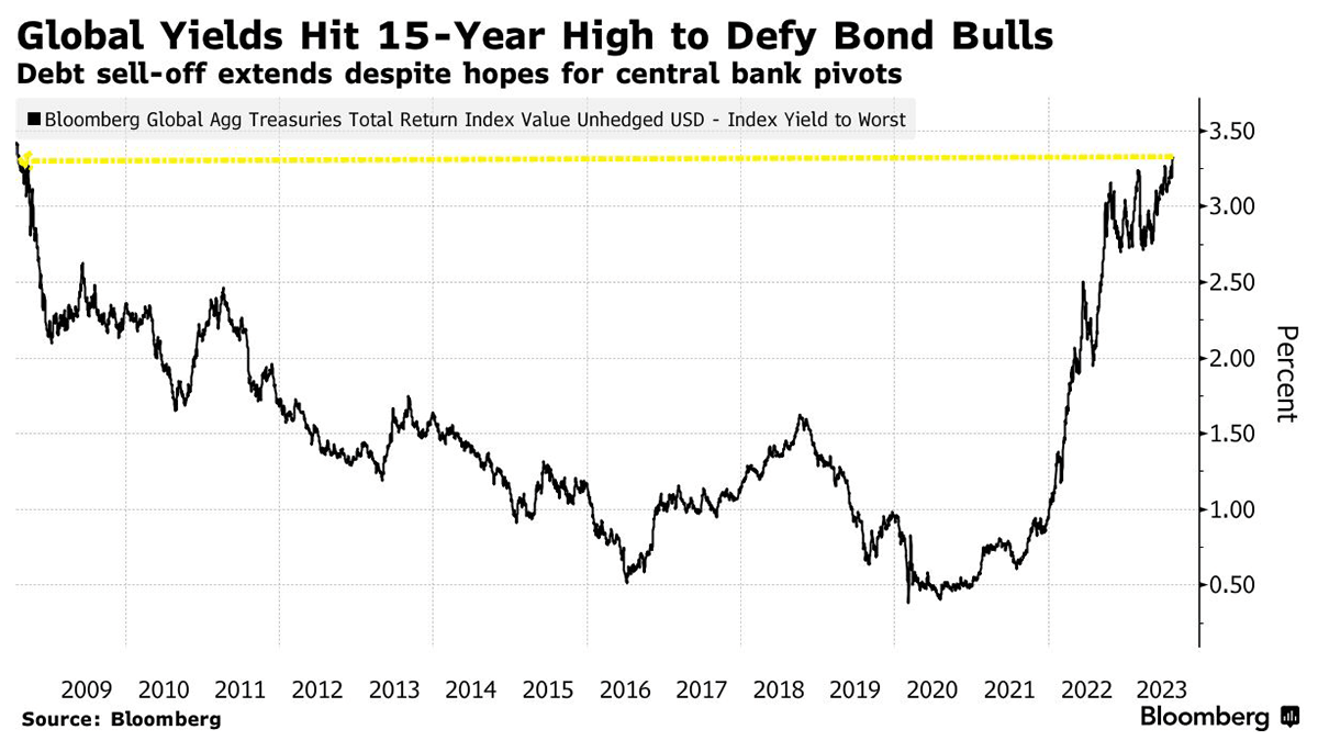 Global government bond yields are rising, including the US 30-year yield reaching levels not seen since 2011 and other benchmarks approaching levels from 2008. This rise is driven by robust economic data challenging the assumption that central bank rates have peaked. The 10-year US Treasury yield closed at its highest level since 2007 last week at 4.307%, while the 30-year US Treasury yield hit a 12-year high of 4.411%. Similar trends are observed in the UK and Germany. Treasuries have been leading the global bond sell-off as the US economy continues to perform well despite significant Federal Reserve rate hikes. Some experts suggest that an additional rate hike later in the year might be employed to ensure inflation remains contained. Despite the strong US labor market data, global bonds have suffered a 1.2% loss this year, contrasting the positive start they had due to expectations that rate hikes were ending.