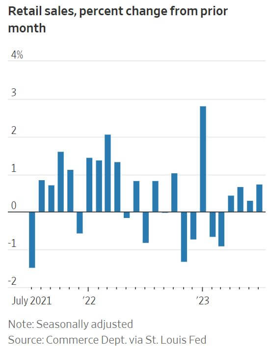 American retail spending experienced its quickest increase since the beginning of the year, demonstrating the resilience of the U.S. economy. Despite the Federal Reserve's interest rate hikes to counter inflation, consumers continued to spend more on items like dining out, back-to-school supplies and clothing. Retail sales, encompassing store, online and restaurant purchases, surged by a seasonally adjusted 0.7% in July compared to the prior month, a jump from June's 0.3% growth. The rise in retail sales surpassed the 0.2% increase in consumer prices for the same month, indicating that consumer spending is outpacing inflation. Although the strong labor market is contributing to consumer confidence and spending, economists anticipate a potential slowdown after the summer months, especially in sectors like travel and entertainment. The report also revealed that consumers increased spending at grocery stores, hardware stores and online platforms. However, sales declined at auto dealerships, electronics stores and furniture stores, which are sensitive to higher borrowing costs. Gasoline sales increased 0.4% in July, corresponding with a rise in gasoline prices. The report mainly captures spending on goods and not most services like travel, housing and utilities. Despite the positive outlook for consumer confidence and spending, certain retailers are preparing for uncertainty due to shifting consumer behaviors and the impact of the Federal Reserve's moves on spending patterns.