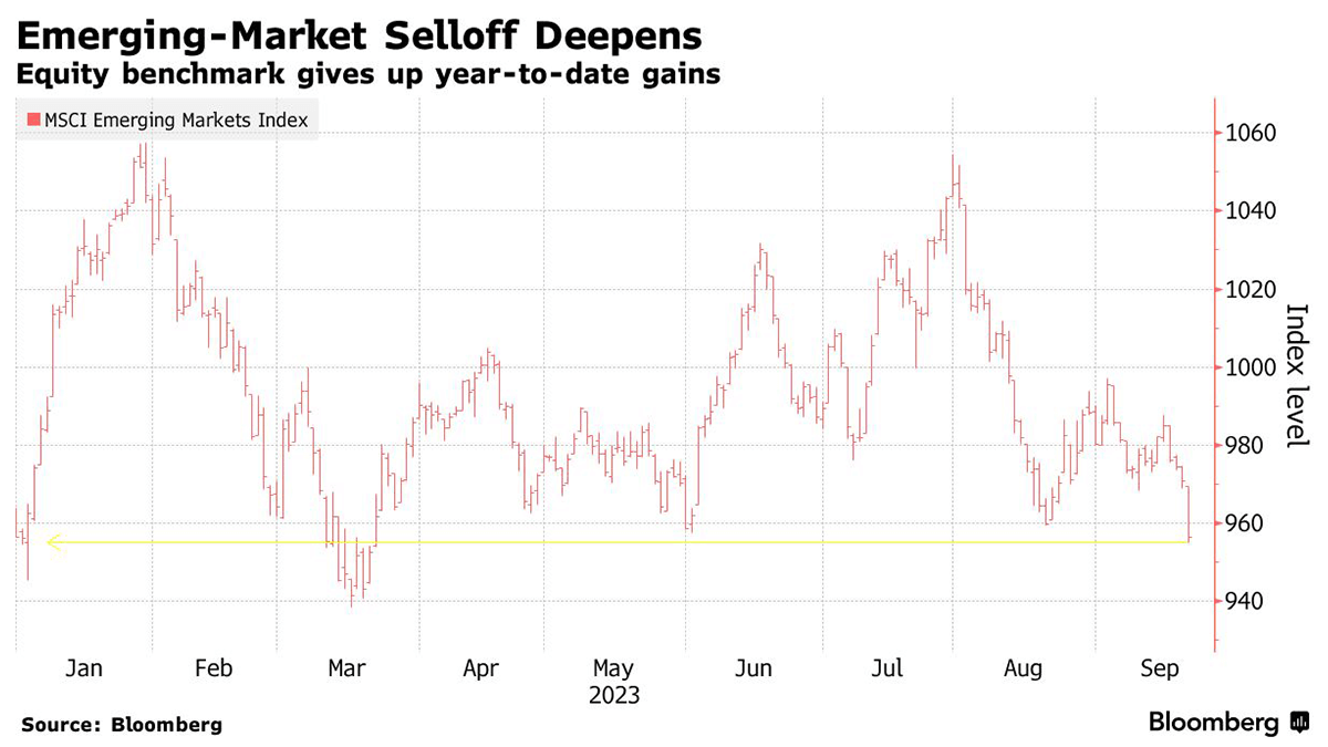 The US dollar has surged against major currencies in the last two months, largely due to a growing divergence in the global economy. While the US economy has defied earlier pessimistic forecasts and continued to perform strongly, growth in China and Europe has faltered. Many economists had predicted that the Fed would be shifting towards recession-fighting measures by now, including reducing interest rates. However, the US economy has outperformed expectations, leading investors to move their funds to the US, where higher interest rates are expected to persist. This shift in investor sentiment has driven the Bloomberg Dollar Spot Index back towards its yearly highs after an eight-week rally starting in mid-July. Though the current dollar surge is not as steep as the one experienced in 2022, it still has global consequences, especially in emerging markets. A stronger dollar makes imports more expensive and intensifies inflation pressures, forcing central banks in developing nations to maintain high interest rates to protect their currencies and prevent capital flight. The combination of the Fed signaling a prolonged period of higher interest rates and China's economic challenges has created a double shock for emerging-market equities. The ongoing underperformance of emerging market equities relative to US equities is now extending into a sixth consecutive year. Earnings estimates for companies in the MSCI gauge have fallen by 2% this year, and valuations remain relatively high, with the index trading at 11.8 times the projected earnings of its constituent companies, only slightly below the five-year average.