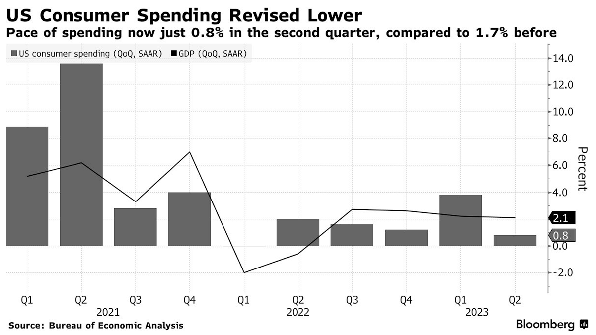 In the second quarter, U.S. consumer spending experienced a slower growth rate than previously reported, primarily due to weakened services spending according to new government data. Personal consumption, a key driver of the U.S. economy, increased at an annualized rate of 0.8% during April to June, marking a significant drop from the prior estimate of 1.7% and representing the weakest growth in over a year. Nevertheless, overall GDP remained unchanged, growing at a 2.1% rate during the same period. The slowdown in consumer spending was partially offset by stronger business fixed investment, which increased at a pace of 7.4%, up from the previously reported 6.1%. The slowdown in spending brings renewed focus on household savings balances, which saw a substantial increase due to government stimulus checks and reduced spending opportunities during the pandemic. The amount of remaining savings is significant, as it could bolster consumer spending in the coming months and act as a financial cushion, making it easier for individuals to weather economic downturns and reducing the likelihood and severity of recessions. A pessimistic estimate from the Federal Reserve Bank of San Francisco suggests excess savings peaked at around $2.1 trillion in August 2021 but had dwindled to less than $190 billion by the second quarter of 2023. However, different assumptions and data revisions can lead to varying estimates. Goldman Sachs, for instance, calculated about $1.3 trillion in excess savings as of July, equal to 5% of GDP. Data from Bank of America suggests that increased cash holdings have been relatively evenly distributed across income groups, with median household savings and checking balances up by over 40% compared to 2019 for low-, medium- and high-income households. This distribution reflects the strength of the labor market, allowing people to maintain spending without significantly depleting their accumulated savings.
