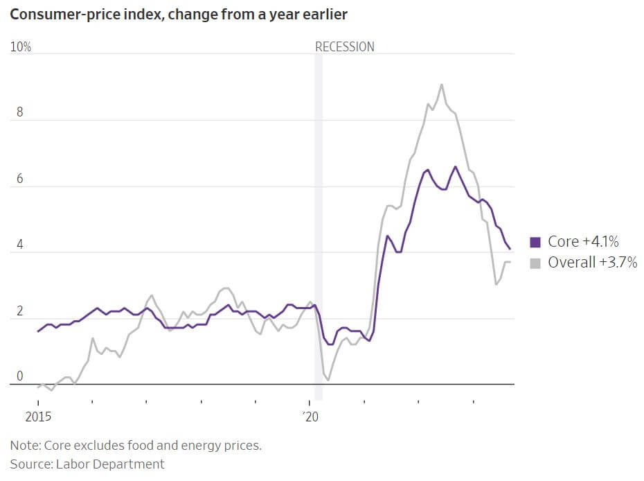 In September, progress in reducing inflation slowed, indicating a challenging path to eliminating price pressures. The Consumer-Price Index (CPI) increased by 0.4% from the previous month and 3.7% from a year ago. When volatile food and energy items are excluded, core prices rose by 0.3% in September and 4.1% over the previous year. Meanwhile, prices paid to U.S. producers (PPI) exceeded expectations in September, with a 0.5% increase in the producer price index for final demand. This was driven by a 5.4% rise in gasoline costs. When excluding food and energy, the PPI increased by 0.3%. Over the year, the overall measure rose by 2.2%. The increase in prices was mainly due to higher energy costs and a significant rise in food prices. Excluding these components, prices for goods only edged up by 0.1%, while service costs increased by 0.3%, primarily led by financial services. Gasoline prices have fluctuated, and housing costs are expected to provide relief from inflation in the coming months. Used car prices have declined.