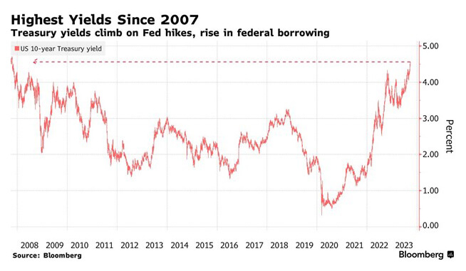 The Federal Reserve's historic cycle of interest rate hikes may be approaching an anticlimactic conclusion due to a sustained rise in long-term Treasury yields. Key central bank officials have indicated that they might cease raising short-term interest rates if long-term rates remain high and inflation continues to moderate. In July, the Fed raised its benchmark federal-funds rate to a range of 5.25% to 5.5%, a level not seen in 22 years. Although officials kept rates unchanged at their recent meeting, they hinted at potential rate hikes in one of their last two meetings for the year. The surge in long-term Treasury yields began after the July rate increase and accelerated following the September Fed meeting. If long-term Treasury yields continue to rise they might obviate the need for further increases in the federal-funds rate. Initially, the increase in long-term rates was attributed to favorable economic news, diminishing expectations of a recession prompting the Fed to lower rates in the first half of the following year. However, it is increasingly evident that factors beyond economic and Fed policy outlooks, such as mounting government deficits, are influencing the rise in rates, which suggests an increase in term premiums (the extra yield demanded by investors for longer-dated assets). Term premiums are challenging to measure precisely, but they appear to account for at least half of the increase in long-dated Treasury yields since late July. Fed Vice Chair Philip Jefferson and other officials have indicated their awareness of the tightening in financial conditions through higher bond yields when deciding on future rate increases. Given these remarks, it appears that the Fed is likely to maintain steady rates at its October meeting. The Fed may wait to assess economic and financial developments before deciding on further rate hikes in December.