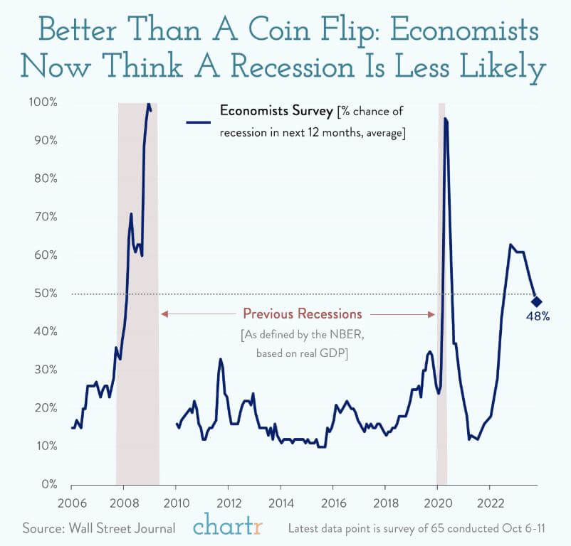 Economists in a recent Wall Street Journal survey are growing more optimistic about the U.S. economy. They have reduced the probability of a recession in the next year from 54% to 48%, marking the first time it's fallen below 50% since the middle of the previous year. This shift is attributed to factors such as declining inflation, the Federal Reserve's decision to stop raising interest rates, and the resilience of the labor market and economic growth surpassing expectations. In the fourth quarter of 2023, GDP is expected to increase by 2.2%, a significant upward revision from the previous forecast of 1%. Although economists have slightly lowered their predictions for next year, they still anticipate continued growth in 2024 and 2025, with the unemployment rate remaining just above 4%. However, the initial half of 2024 may see weak economic growth and job creation due to high interest rates.