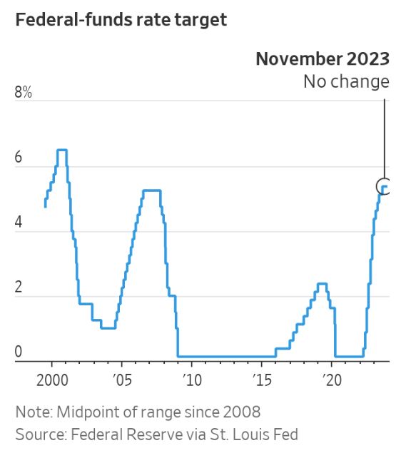 The US Federal Reserve maintained its current interest rate at a 22-year high at its most recent meeting and indicated a potential willingness to increase rates in the future to combat persistent inflation. Officials characterized recent economic performance as robust and emphasized the potential negative impact of rising long-term interest rates on economic activity. This decision comes amid rising concerns in financial markets, as the 10-year Treasury yield has increased substantially since the last rate hike, which occurred in July, bringing the benchmark federal-funds rate to a range between 5.25% and 5.5%. Notably, the Fed has now refrained from raising rates for two consecutive meetings. A continued deceleration in inflation might lead to a continued pause in rate hikes, while any acceleration in price pressures could prompt them to raise rates once more. Since their last meeting in July, the economic landscape has been influenced by three significant factors with varying implications for monetary policy. Firstly, economic activity has exceeded expectations, with consumers increasing spending and employers expanding payrolls. Second, inflation has moderated, with core inflation, excluding food and energy prices, dropping from its peak of 5.6% to a 2.8% annualized rate over the April-to-September period. Thirdly, financial conditions have tightened due to a rapid increase in long-term Treasury yields, resulting in higher borrowing costs for households and businesses. The Fed faces a delicate balancing act as sustained economic growth could raise concerns about potential overheating, given the economy's resilience to rapid rate hikes and other stressors. Fed officials are cautious not to overdo rate hikes to avoid an unnecessary economic downturn, while also being wary of allowing inflation to exceed their 2% target. The debate within the Fed varies, with some advocating for a more gradual approach in the face of slowing inflation and wage growth, while others argue for additional rate hikes as a precaution against the possibility of economic and inflationary resilience.