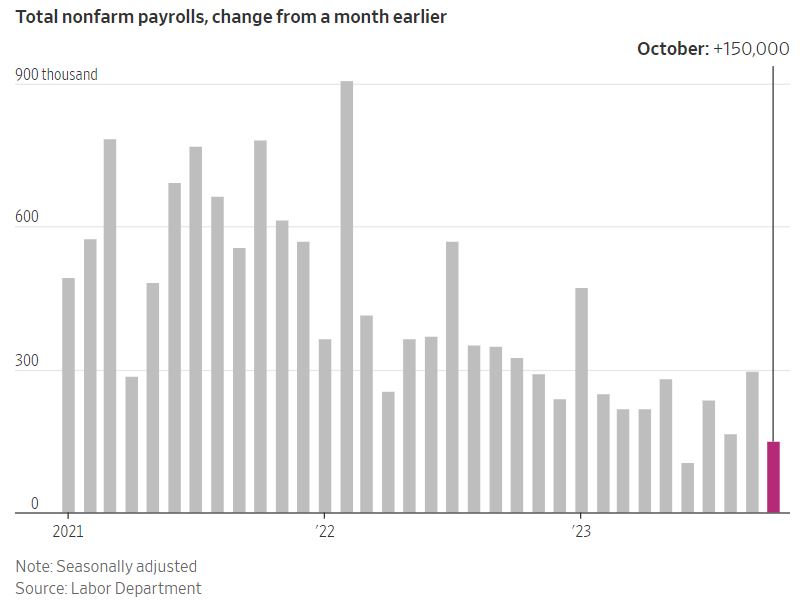The US experienced a significant deceleration in hiring in October, indicating a cooling economy after a robust summer. According to the Labor Department, US employers added 150,000 jobs in October, a notable drop from the previous month's revised gain of 297,000, marking the smallest increase since June. The United Auto Workers strike played a role in this slowdown, with automakers reducing their payrolls by approximately 33,000 workers. The unemployment rate also inched up from 3.8% to 3.9% over the previous month. Wage growth also showed signs of cooling as employers hired fewer workers. Average hourly earnings increased by 4.1% compared to the previous year, down from the 4.3% growth observed in September. The labor force participation rate slightly decreased from 62.8% in September to 62.7% in October. Some experts, like Andrew Hunter, Deputy Chief US Economist at Capital Economics, view this report as an indication that the third-quarter economic strength is likely to unravel in the fourth quarter. With wage growth slowing down, it becomes increasingly difficult to envision the Fed raising interest rates further. The surprising resilience of the US economy in 2023, despite forecasts of a recession and higher borrowing costs, can be attributed to the strong labor market, which continued to create jobs. This robust job market encouraged consumer spending, contributing to GDP growth in the third quarter, which was the fastest since 2021. Forecasters and the Federal Reserve now expect the economy to avoid a recession and gradually slow down to keep inflation in check. The strong labor market has enticed more people to seek employment, resulting in the highest workforce participation rate in over two decades. This trend could make it easier for employers to find workers, helping to maintain wage growth and inflation at manageable levels. Fed Chair Jerome Powell cited the cooling labor market as a reason for a potential pause in rate hikes. He highlighted increased labor-force participation and immigration as positive signs that the economy could thrive without significant price increases.