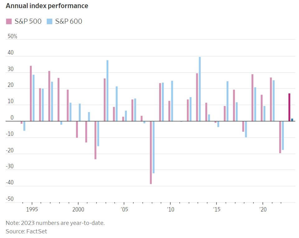 The S&P 600, an index comprised of smaller companies, has experienced a robust autumn stock-market rally, gaining 8% since October 27, albeit slightly trailing the S&P 500. However, YTD the S&P 600 lags significantly behind its large-cap counterpart by the widest margin since 1998. Smaller companies, reliant on speculative financing, have been disproportionately affected by the Federal Reserve's interest-rate strategy. The core issue lies in the prevalence of floating-rate debt among small-caps, with approximately 40% of S&P 600 companies having such debt compared to only 10% in the S&P 500. This distinction exposes smaller companies to higher interest expenses that dent their bottom lines. In contrast, larger companies, having predominantly opted for fixed-rate debt in 2020 and 2021, are more insulated from interest rate fluctuations.