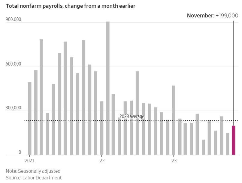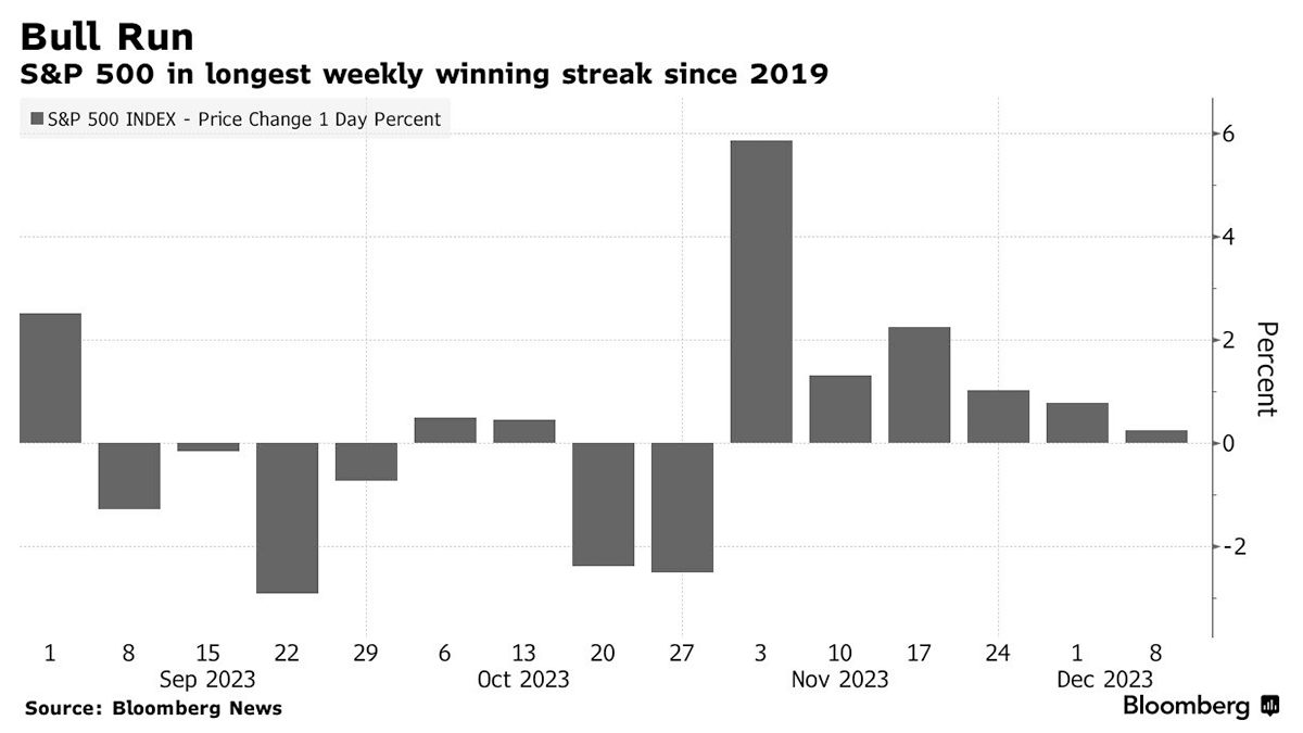 The prevailing sentiment on Wall Street is that while economic strength diminishes concerns of a hard landing, it also implies that the Federal Reserve might need to maintain higher interest rates for an extended period. The jobs report released on Friday came in somewhat stronger than expected, with the US economy continuing to exhibit strength. Market participants are reassessing expectations as a result, with the narrative shifting from anticipating rate cuts to acknowledging the Fed's potential to maintain higher rates for a more extended period. The recent decline in inflation and employment data had prompted expectations of rate cuts, but the strong economic readings have prompted a reevaluation. The S&P 500 has achieved its sixth consecutive week of gains, marking its longest winning streak since November 2019. The VIX, Wall Street's fear gauge, hovers near pre-pandemic levels. However, the flip side is that bond traders are now compelled to scale back their bets on rate cuts in 2024, leading to a rise in yields. The yield on the two-year US Treasury note rose 12 basis points on Friday to 4.72%. Interest rate swaps contracts imply that the probability of an interest rate cut in March dropped to 40% from over 50% earlier in the week. Despite the market initially rallying on the rate-cut trade, some believe that hopes have gone too far, considering the continuous strength of the U.S. economy. Investors are cautious about not overestimating the potential for rate cuts in 2024, with markets now pricing in around 110 basis points of cuts next year compared to the previous 125 basis points. The upcoming week is anticipated to be busy, with key economic readings, Treasury auctions, and the final Fed meeting of the year. Fed officials are expected to maintain borrowing costs at the highest level in two decades. There's a recognition that the Fed, despite better-than-expected data releases, may continue to adopt a cautious approach and not declare victory on quelling inflation. Despite signs of a potential soft landing, confidence in this outcome is not absolute.