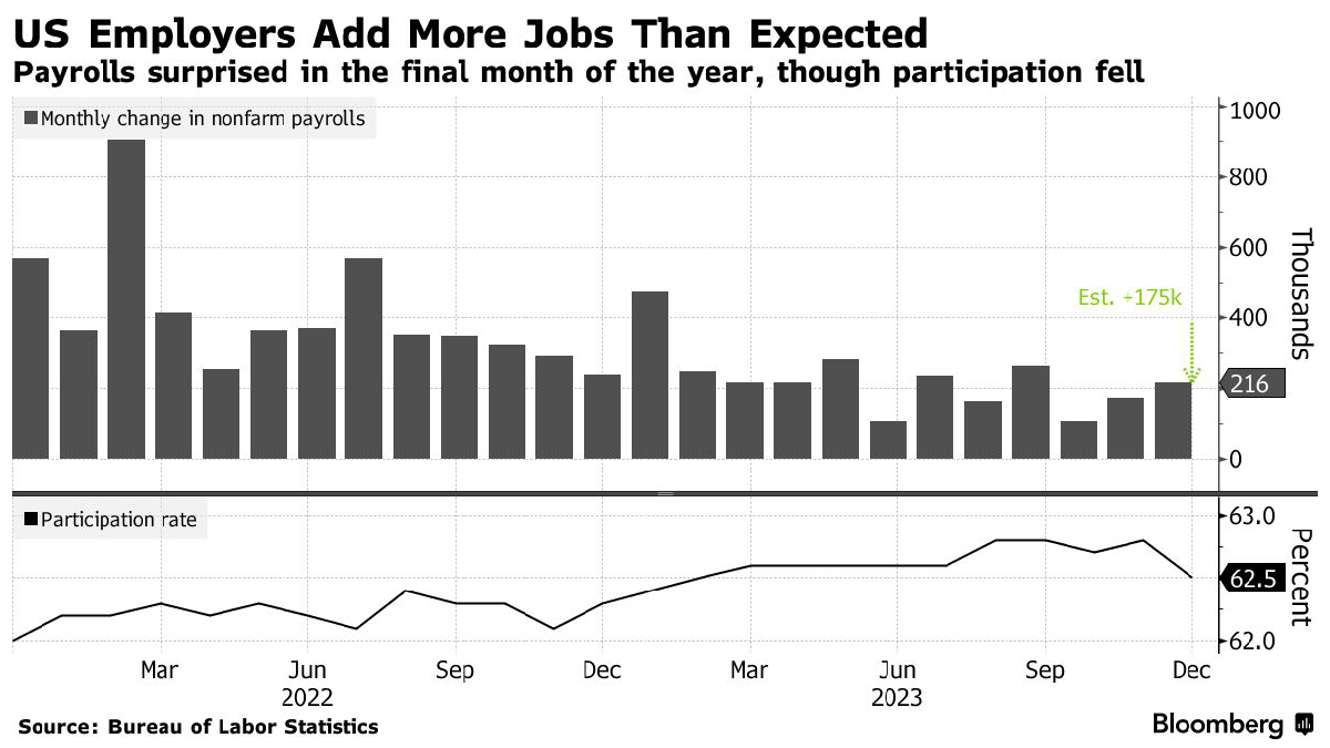 Last week, two reports showed that the labor market remains strong despite high interest rates, though some figures suggested softening. The United States experienced a decline in job openings in November, reaching the lowest level since early 2021, suggesting a cooling demand for labor. The Bureau of Labor Statistics Job Openings and Labor Turnover Survey (JOLTS) reported a decrease from 8.85 million to 8.79 million vacancies. Hiring also dropped to its lowest point since April 2020. Notably, layoffs saw a slight decrease. The quits rate, reflecting voluntary job departures as a percentage of total employment, reached its lowest point since September 2020. The ratio of job openings to unemployed individuals remained at 1.4, a significant decrease from its 2-to-1 peak in 2022. Meanwhile, the nonfarm payrolls survey for December showed a notable uptick in job growth with payrolls increasing by 216,000, surpassing the median estimate of 175,000. The unemployment rate remained stable at 3.7%, and average hourly earnings exceeded expectations by rising 0.4% from the previous month. Kathy Jones, Chief Fixed Income Strategist at Charles Schwab, characterized the overall job market as steadily cooling off, but emphasized that the increase in average hourly earnings might influence the Federal Reserve to maintain its current stance for a longer duration than the market anticipates. Despite these positive aspects, the labor-force participation rate experienced its largest monthly drop in nearly three years, particularly affecting younger and older cohorts. The duration of unemployment spells extended, and the number of full-time employees saw the most significant decline since April 2020. Furthermore, the report indicated a decline in temporary-help employment, often considered a precursor to recession, reaching its lowest point since May 2021.